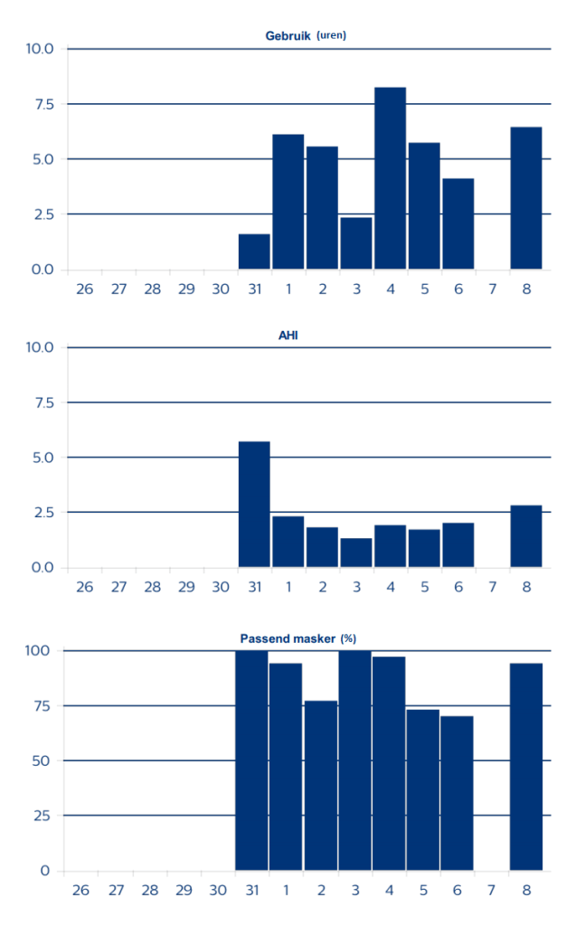 Mijn eerste week is een beetje wisselend, als je naar de statistieken hierboven kijkt. Er zijn een aantal dagen dat ik wel boven de vijf uur uit kom qua gebruik. Een keer ben ik in slaap gevallen zonder masker op en een keer heb ik hem in mijn slaap afgekoppeld en niet meer wakker (genoeg) geworden om het weer aan te sluiten. Heel handig!