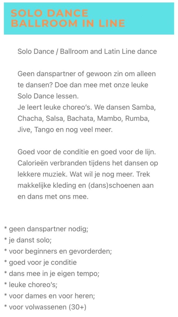 En dat is gelukt! Na wat oriƫnteren heb ik mij ingeschreven voor een Solo dance proefles bij een dansschool niet al te ver van Rotterdam. Even sfeer proeven en kennismaken.