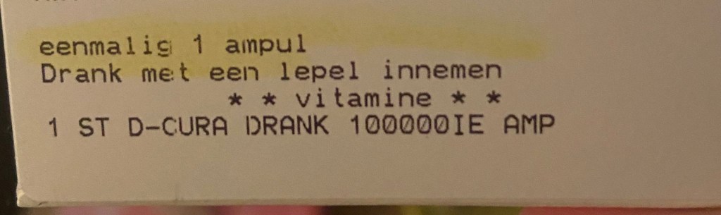 Tijd voor de rest van mijn medische achtergrond. Eerst hebben we de bloeduitslagen doorgenomen. Voor de te lage vitamine D krijg ik wederom een kuur. Deze keer een maandelijkse shot voor de duur van een jaar, waarvan de eerste een dubbele is.