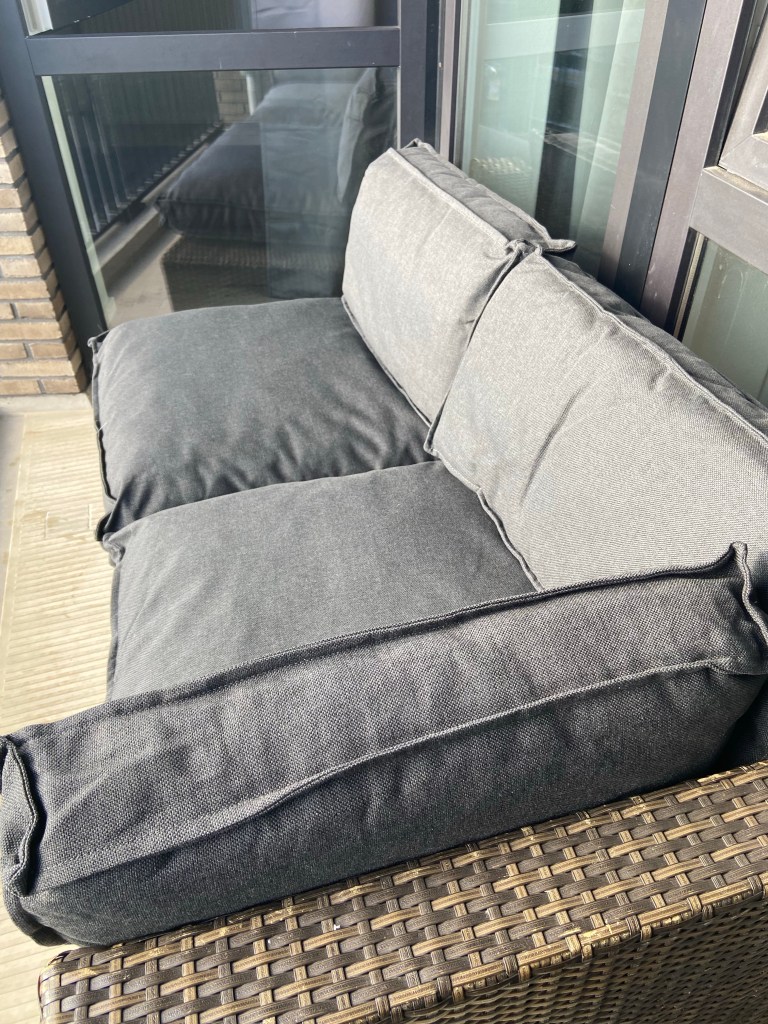 Als het eenmaal ontdooid is zet ik het nog eventjes kort in de oven en begin daarna aan een overheerlijk stukje bananenbrood (110 gram). Terwijl ik eet bedenk ik mij dat het misschien wel lekker is om even op het balkon te zitten en te genieten van de nieuwe kussens op mijn loungeset, die ik voor m’n verjaardag kreeg.