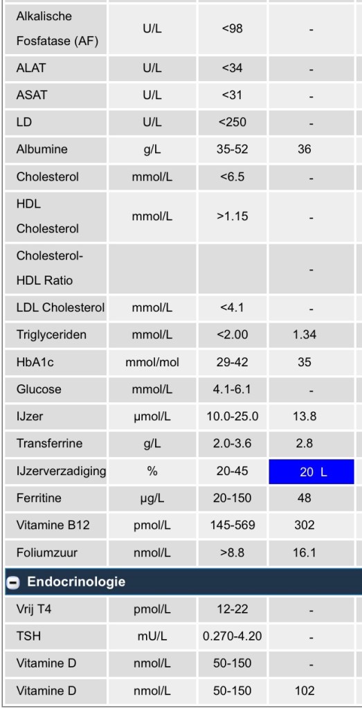 Ik ben half december in het ziekenhuis geweest om bloed te prikken. Hoewel er een waarde blauw gekleurd is omdat deze op de ondergrens ligt, hoef ik mij geen zorgen te maken. Dit gaat over de ijzerverzadiging en is een momentopname. Dit kan gewoon net op een moment zijn geweest dat m’n lichaam er even iets harder voor moest werken. Belangrijker is dat de ferritine in orde is. Wat gelukkig het geval is.