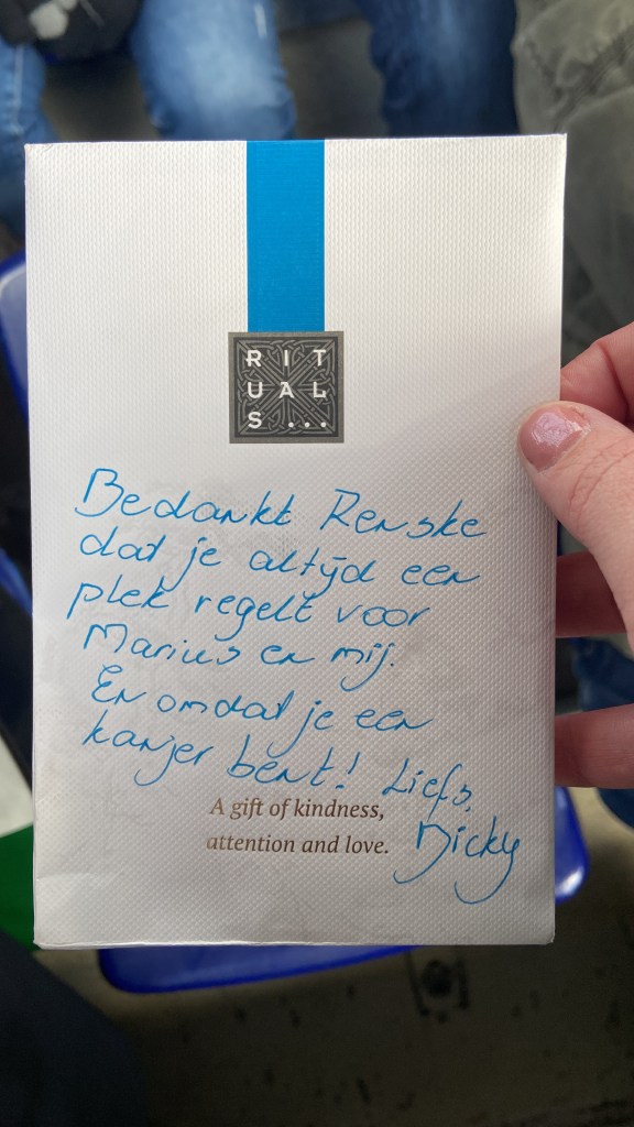Vandaag gebeurde er een paar dingen. Waardoor ik weer besefte dat het niet erg is om af en toe een stukje meer van mijzelf te laten zien. Zo kreeg ik dit van een vrouw uit mijn Feyenoord vriendengroep. Ik vond het heel attent en ook erg onnodig, want met liefde houd ik een plaatsje voor ze vrij.
