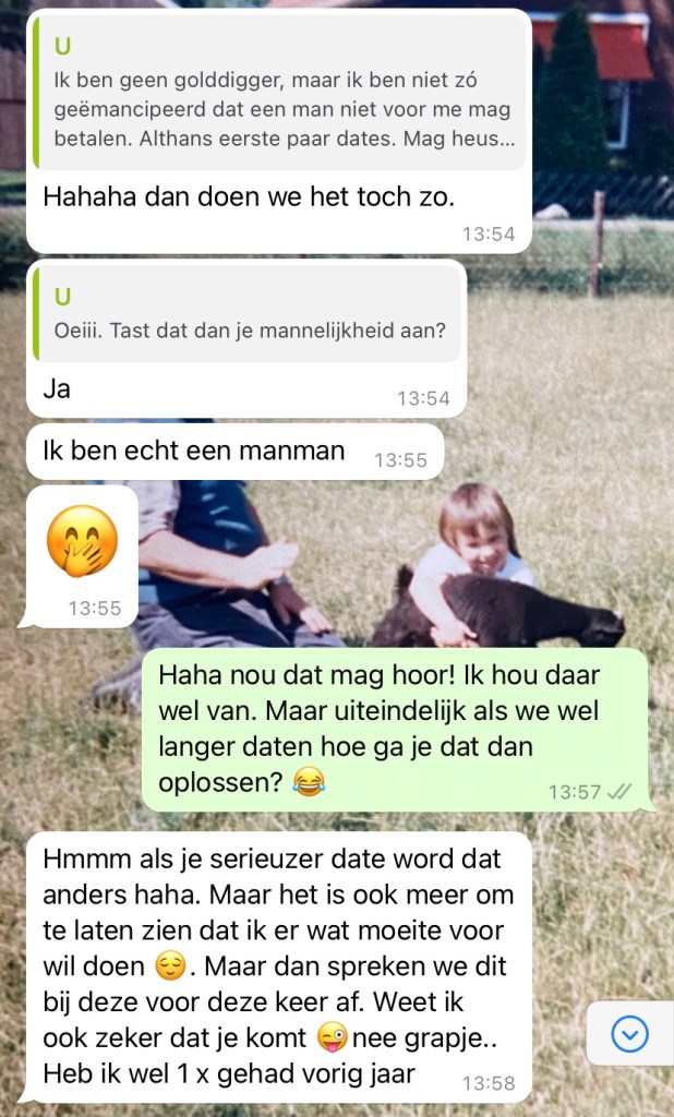 Ik wil echt wel bijdragen aan een date met serieuze intenties waar we vaker dan één keer gaan daten. Maar zoals ik al zei, hoffelijkheid vind ik ook belangrijk. Hij lijkt in te stemmen, alleen dan krijg ik een berichtje die ik niet helemaal begrijp.