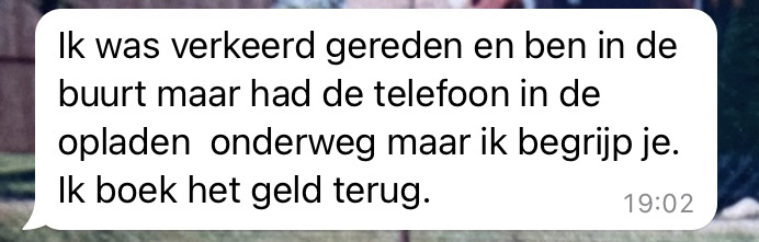 Met m’n lieve buur-dinnie P. ga ik buiten even staan kletsen tot de tijd is verstreken. Want wie weet is er toch echt een hele goede en legitieme verklaring voor, die ik zelf niet geloof maar mijn omgeving is nog wat beter van vertrouwen dan ik. We doen nog even samen boodschappen en als het inmiddels 18.45 is vraagt ze wat mijn volgende stap is. Want hij heeft uiteraard ook helemaal niks meer laten weten. Ik vermoed dat ik wel kan fluiten naar mijn geld, maar ik laat het zeker niet zonder enig woord voor wat het is. Stipt om 19:00 stuur ik hem;