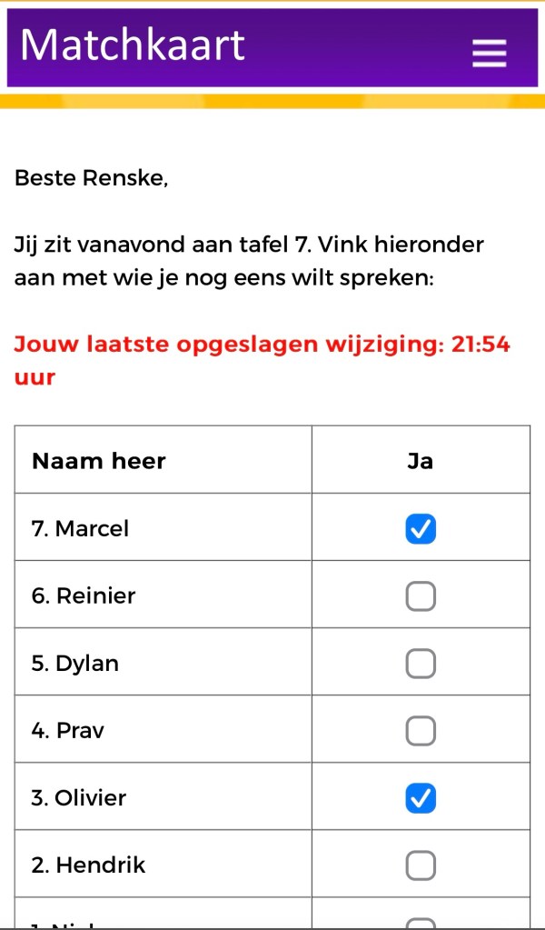 Uiteraard mag je ook pas aan het einde alle namen aanvinken, dit kan nog tot 15 minuten na het speeddaten. Maar tegelijkertijd moet je die namen dan wel onthouden. Ik koos ervoor de namen van de mannen die ik interessant vond in de notities van m’n telefoon te zetten. Wat maar goed was ook, want het was een vermoeiende avond. Want tuurlijk voer je leuke gesprekken, maar het is niet zo dat alle 14 mannen mijn interesse hebben. Verre van zelfs. Er waren twee mannen die ik oprecht heel leuk vond, waarvan ik een van hen al een soort van kende. Ik had hem namelijk aan het begin van het jaar ook al eens voorbij zien komen op de datingapp Breeze, maar die date had hij destijds gecanceld had omdat we niet op dezelfde lijn zitten qua kinderwens.