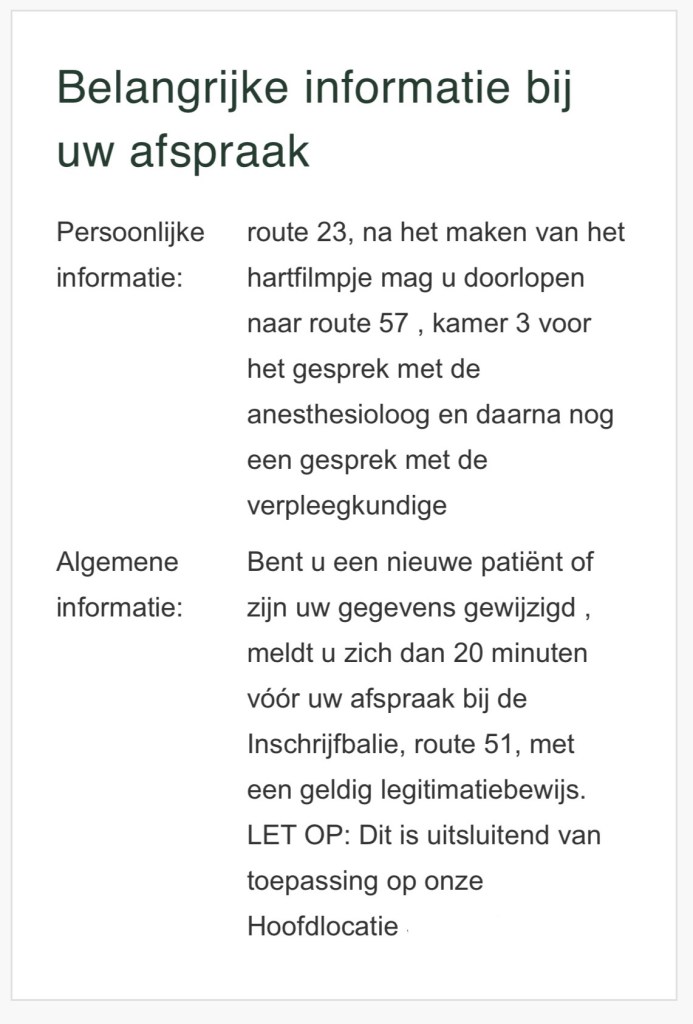 En zo wordt m’n agenda toch nog gevuld met maar liefst drie extra afspraken voor de tweede ronde van de ‘pre-operatieve screening’. En moet ik als nieuwe patiënt van tevoren ook nog even langs de inschrijfbalie. Vroeg op dus tzt!