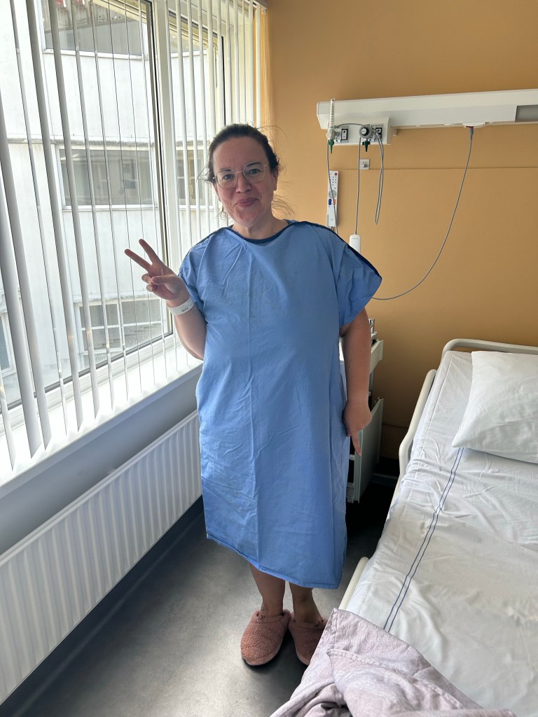Eenmaal gesetteld krijg ik de eerste controles en blijkt dat mijn temperatuur te laag is. Deze is namelijk 36,8 en voor de OK is het noodzakelijk dat deze minimaal 37 graden is. Dus mag ik mijzelf vast gaan omkleden in m’n sexy operatiejurkje, wordt er nog even bloed geprikt en daarna snel het bed in met een warmtedeken om voldoende op te warmen.