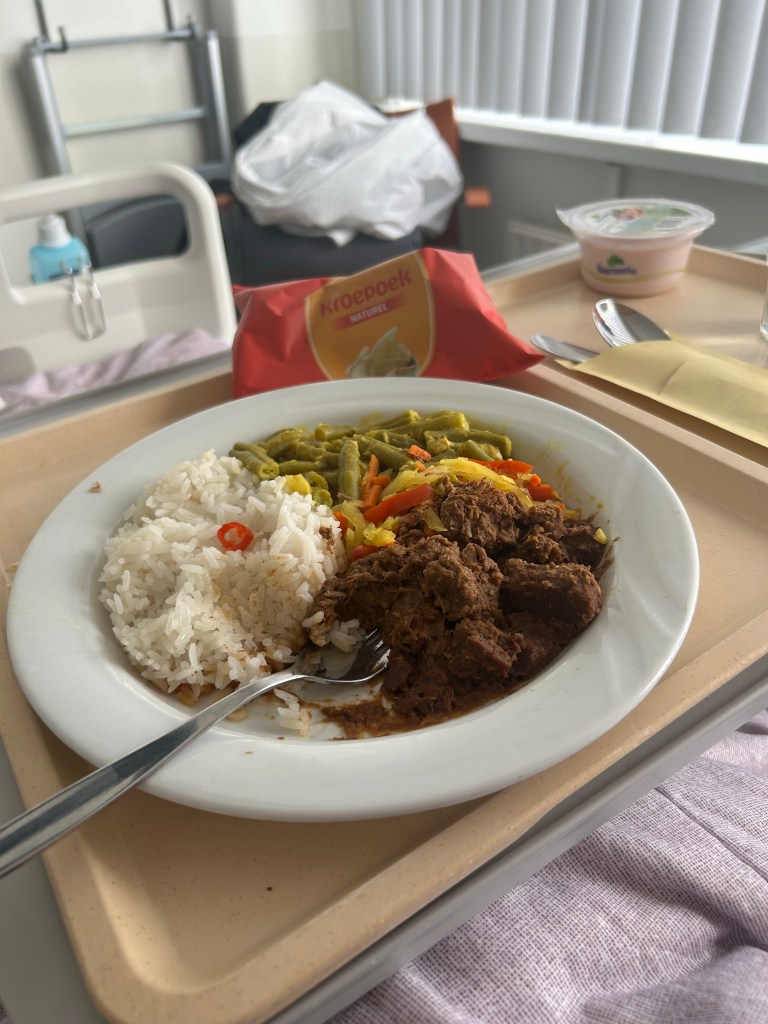 Dan vraag ik de verpleegkundige naar het avondeten. Ik had immers de opdracht gekregen een beetje op te schieten. En niet veel later komt een andere dame van het eten langs. Verbaasd kijk ik naar het zakje kroepoek. Knipogend zegt de dame “we moeten er ook maar een beetje een feestje van maken toch”.