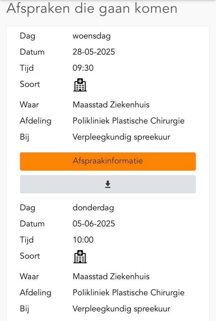 Ik ben compleet overdonderd. WAUW, is dat echt mijn arm? Helemaal onder de indruk blijf ik naar de foto kijken en gluur dan richting mijn in drukverband verpakte armen.. Ik moet nog even geduld hebben. Als ik vervolgens mijn mail open zie ik dat er 2 afspraken ingepland zijn, maar dan weer in het andere ziekenhuis. Aanstaande woensdag is mijn eerste controle-afspraak, waarbij dan de drains er hopelijk uit mogen. Een week later op donderdag staat de tweede controle-afspraak waar de hechtingen verwijderd zullen worden.
