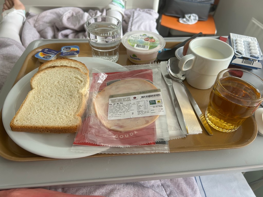 Dan is het tijd voor ontbijt. De dame van de “eetkar” neemt mijn wensen op en komt niet veel later terug met een goed gevuld dienblad. Aan zo’n ontbijt op bed kunnen we wennen denk ik lachend. En alsof ze m’n gedachten hoort zegt ze, “ja we moeten wel een beetje goed voor je zorgen toch!” Dat waardeer ik zeker en ik vertel haar nog over mn nachtelijke snack-momentje en hoe erg ik naar het ontbijt uitkeek! Dan krijg ik een beetje op m’n kop “je had gewoon even op de bel moeten drukken dan had iemand gewoon iets voor je kunnen maken of pakken hoor”! Nouja, voor de volgende keer dan maar? M’n protein reep voldeed prima!