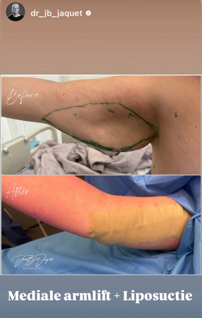 Voordat dr. Jaquet weer verder gaat vraag ik hem of toch nog ergens geregistreerd is hoeveel er is weggehaald. Hij kijkt in het systeem of dit genoteerd is. “Ongeveer 175 gram, 250 cc liposuctie aan vet én 11,5 cm aan huid in hoogte hebben we weggehaald per kant.” Hoewel ik geen idee heb of 250 cc nou echt veel is, denk ik dat we kunnen stellen dat dat mooie gegevens zijn.