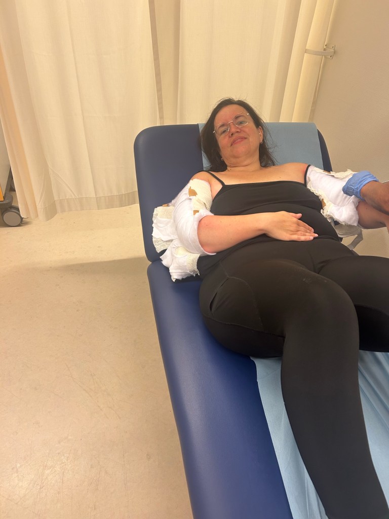 Terwijl de verpleegkundigen de boel wat schoonmaken hoor ik ineens dr. Jaquet zijn stem. “Ziet er goed uit. Heel rustig ook! Beetje blauw, zit nog een beetje een bloeduitstorting hier. Mouwtjes aan, dat is belangrijk! En volgende week halen we dan de hechtingen eruit.” Of nouja de verpleegkundige dan, want hij is er zelf niet. Maar hem zie ik weer over 6 weken. Want ik moet dan een afspraak inplannen waarbij hij dan m’n armen en met name het litteken gaat controleren. En of er dan misschien ook gelaserd moet worden.