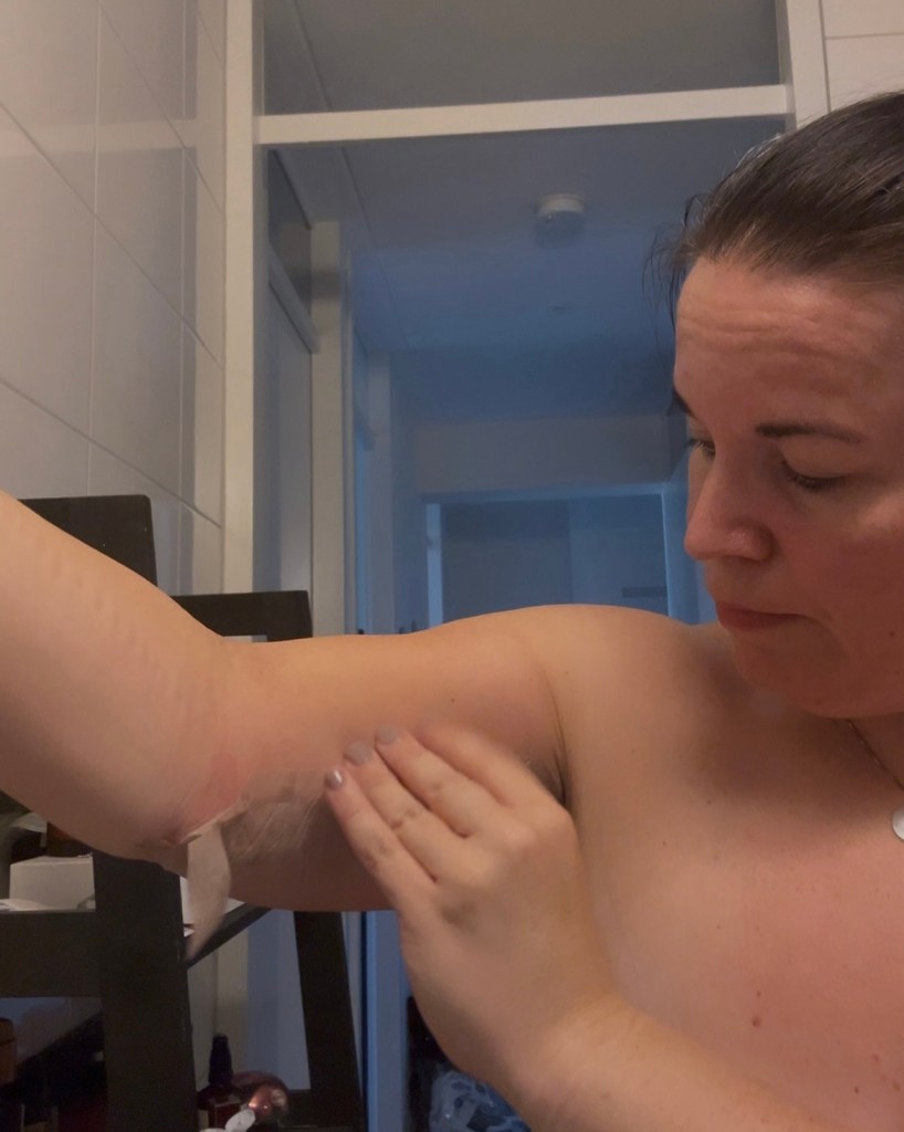 “Deze pleisters moet je iedere twee weken vervangen, mochten ze al loslaten kan het eerder.” En op de pleisters in m’n oksel na blijft het allemaal redelijk zitten. Maar gister en vandaag is het al zo onwijs warm, helemaal met die compressiemouwen aan dat ik heb besloten vandaag de pleisters te vervangen. Ik vind het belangrijk dat niets m’n herstel in de weg zit dus ook geen zweterige pleisters op mn littekens. En het zijn er nogal wat.