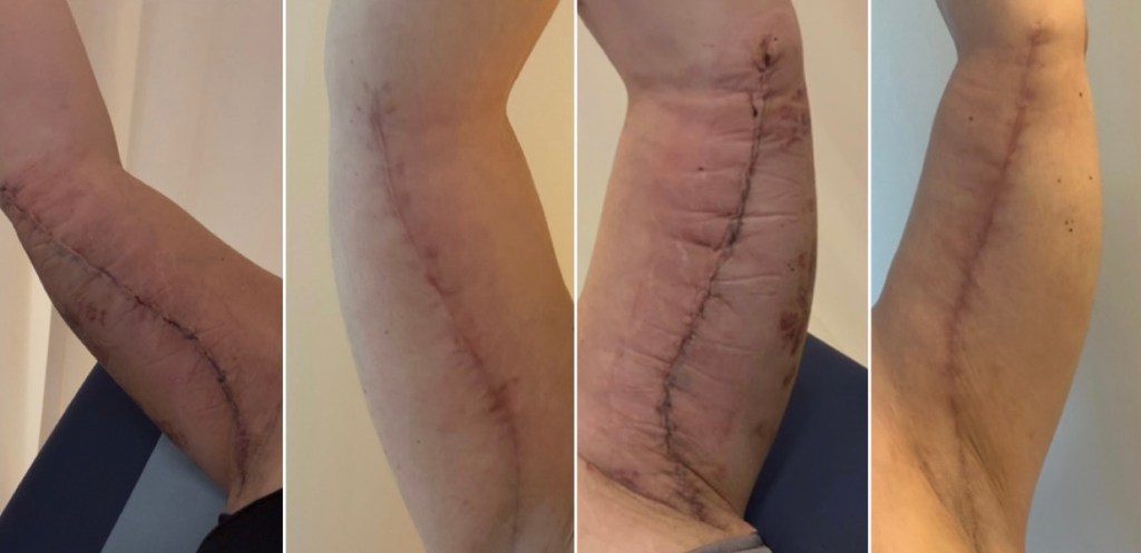 Ik ben echt heel erg blij waar ik nu ben! Zes weken maakt al een enorm verschil. Maar ik kan niet wachten als ik over 3 weken die compressiemouwen uit mag doen en uit mag laten! Aftellen maar!