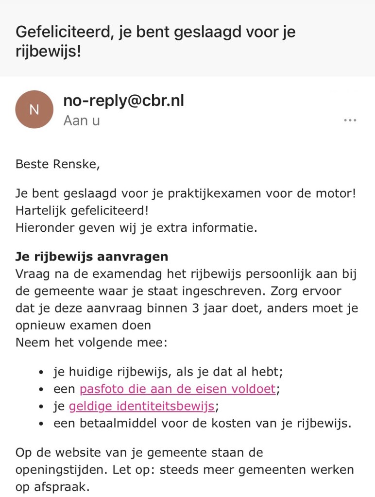Ik was helemaal excited en vervolgde mijn bikergirl-journey, waarbij ik voor m’n verjaardag onder andere de materialen voor het theorie-examen kado kreeg en bijdrages voor de rijlessen van familie en vriendinnen 💖 . Zowel m’n theorie als m’n AVB examen haalde ik in één keer. Tegen al m’n eigen faalangst-achtige verwachtingen in. Maar wat was ik opgelucht!