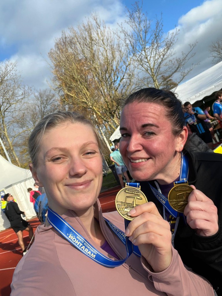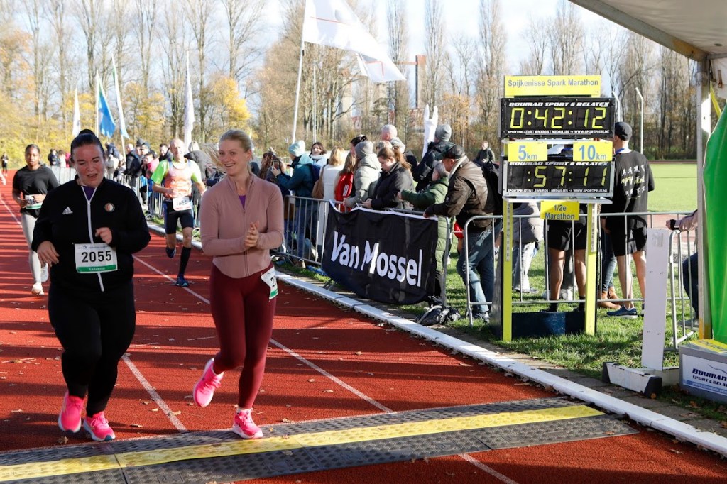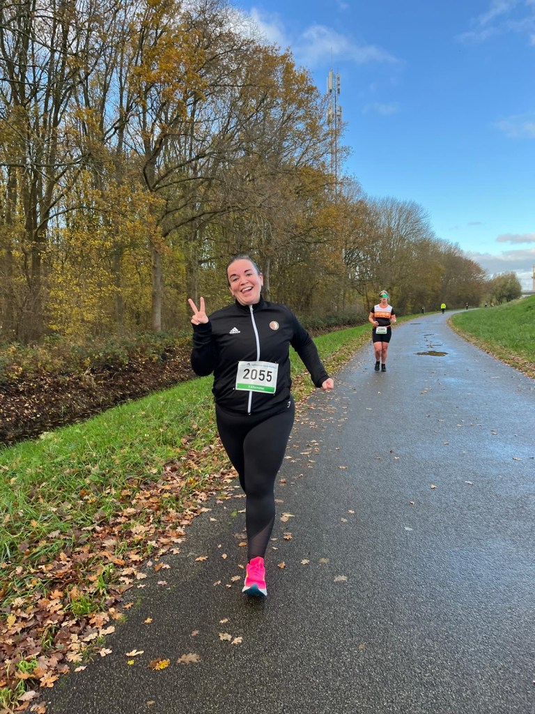 De laatste loodjes wogen wel echt het zwaarst. Ik merkte conditioneel dat ik het eigenlijk nog helemaal niet zo onaardig deed, maar m’n lichaam wel wat pijntjes te krijgen. Vooral m’n bovenbenen en heupen voelde ik. En uiteindelijk begint de energie ook wel iets op te raken. Bij de laatste meters vroeg Jade of ik nog energie had om te versnellen want dan zou ik misschien nog wel een PR kunnen neerzetten. Dus we trekken een sprintje en gaan met 42 minuten op de klok over de finish.