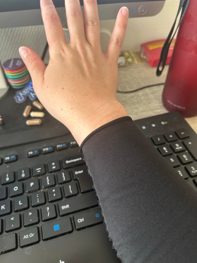 Ai ai ai. Ik was zo ontzettend blij met m’n nieuwe compressiemouwen. Deze mouwen waren iets korter wat zorgde voor veel verademing en hij liep niet maar als een volledig jasje ook nog helemaal tot onder mn borst. Dus ook in mn oksels was er meer ‘ademruimte’.